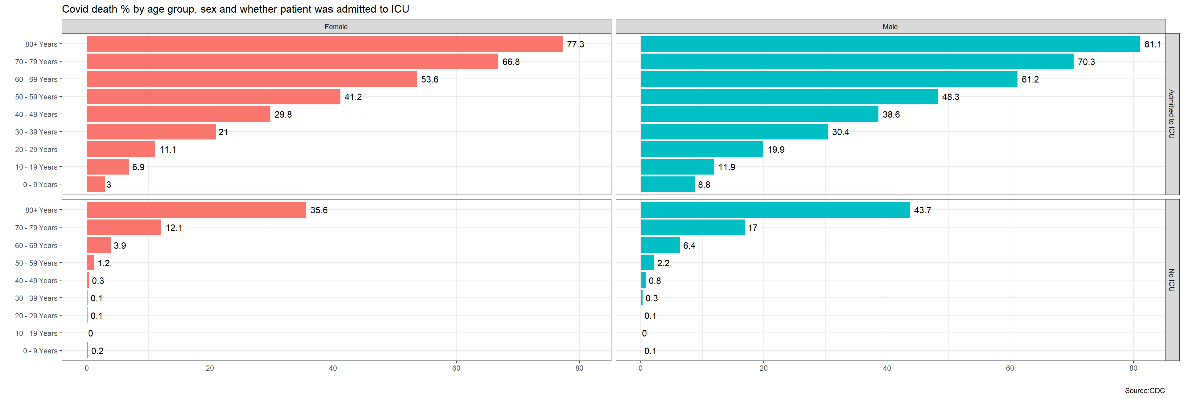 labs(title="Covid death % by age group, sex and presence of co-morbidities",