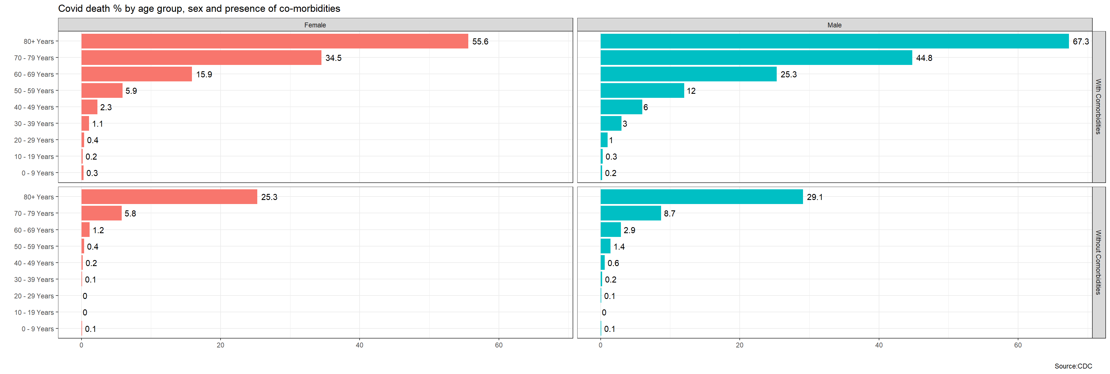 labs(title="Covid death % by age group, sex and presence of co-morbidities",