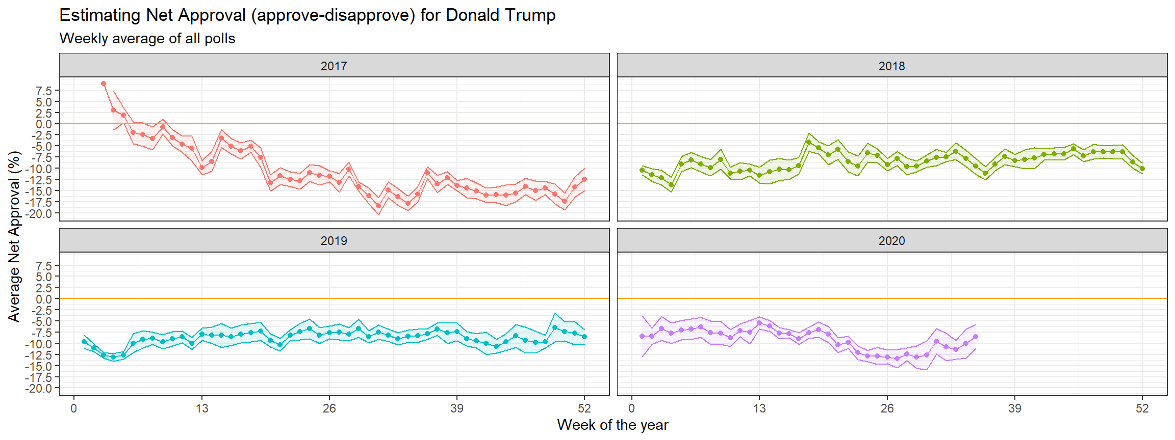 labs(title="Estimating Net Approval (approve-disapprove) for Donald Trump",